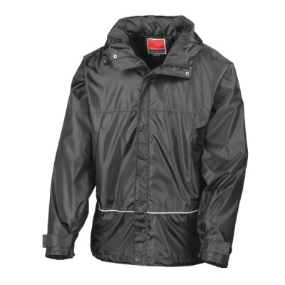 Ripstop waterproof (2,000mm). Windproof. Foldaway shadow printed lined hood with shockcord adjusters. Stud closing stormflap. Full front zip fastening. 2 mesh lined zip closing side pockets. Tear release adjustable cuffs. Adjustable shockcord hem. Decorative reflecting piping around lower body. Fully Taped waterproof Seams. Concealed access for print and embroidery. Also available in kids'